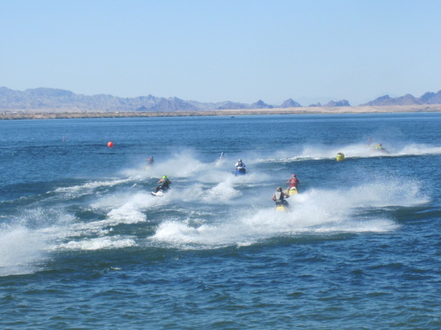 We just got situated, and here came a bunch of the racers, riding through the channel. They were heading to an area called Body Beach, where there is a jet ski course set-up on the lake all the time. I can't imagine racing all day, and they heading to the jet ski course when I was done. They must REALLY like what they do!